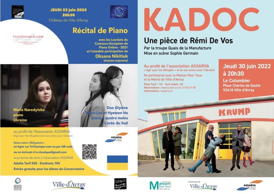 Puis, le 23 juin, l’association « TVClassique.com » a proposé un récital de piano en partenariat avec la mairie et le conservatoire de Ville d’Avray. Les interprètes en étaient les pianistes lauréates du concours européen de piano online : la soliste ukrainienne Maria Narodytska et le duo Glycine de pianistes sud-coréennes Yebin Lee & Hyewon Ha. En soutien à cet événement, Oksana Nikitiuk, mezzo-soprano et chef de chœur ukrainienne, a chanté en ouverture et clôture du concert.