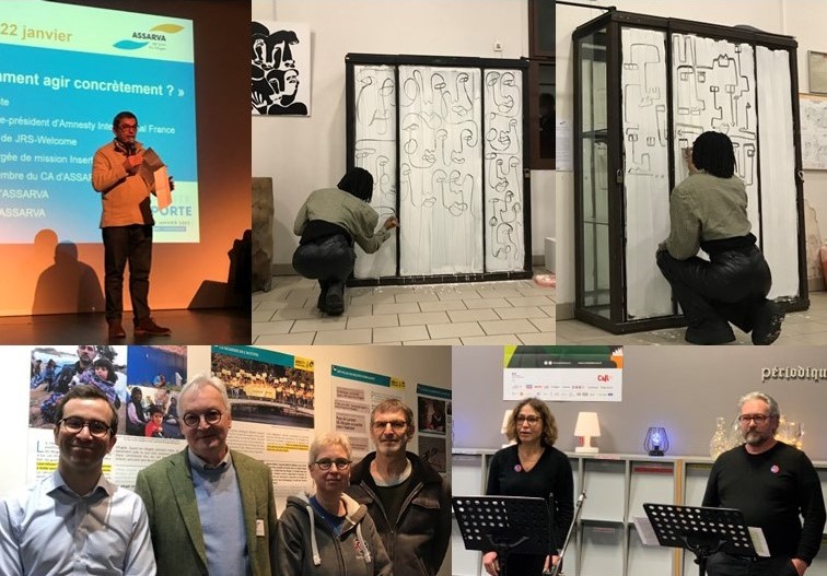 - Table ronde « Comment agir concrètement ? », le 22 janvier pour apporter des éléments de réponse à la question. Introduite par Pascal Rambaud et animée par Nathalie Leenhardt, elle réunissait autour d’ASSARVA plusieurs représentants d’associations engagées dans l’action en faveur des réfugiés : Jean-Claude Samouiller, président d’Amnesty International France, Violaine Neto-Gameiro, chargée de mission Insertion auprès de l’association Espaces (92), Jean-Baptiste Fouan, bénévole de JRS-Welcome, Annie Burkel, pour ASSARVA. Dominique X., réfugié accueilli et accompagné par ASSARVA depuis fin 2015,a apporté son témoignage.