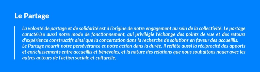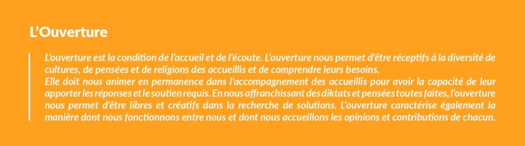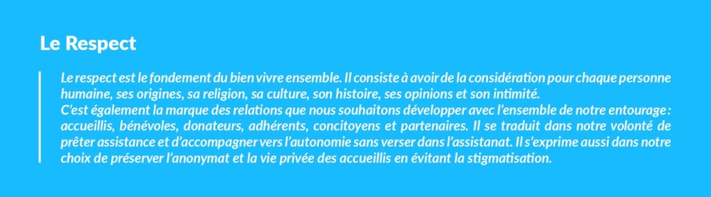 Les principes qui nous guident et irriguent toutes nos relations avec les accueillis, partenaires et concitoyens :